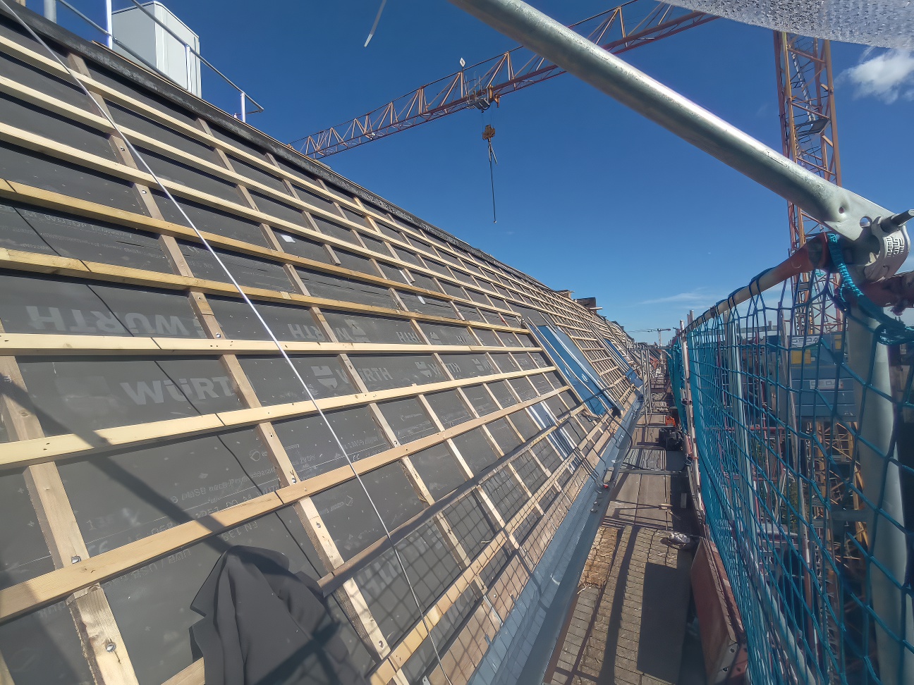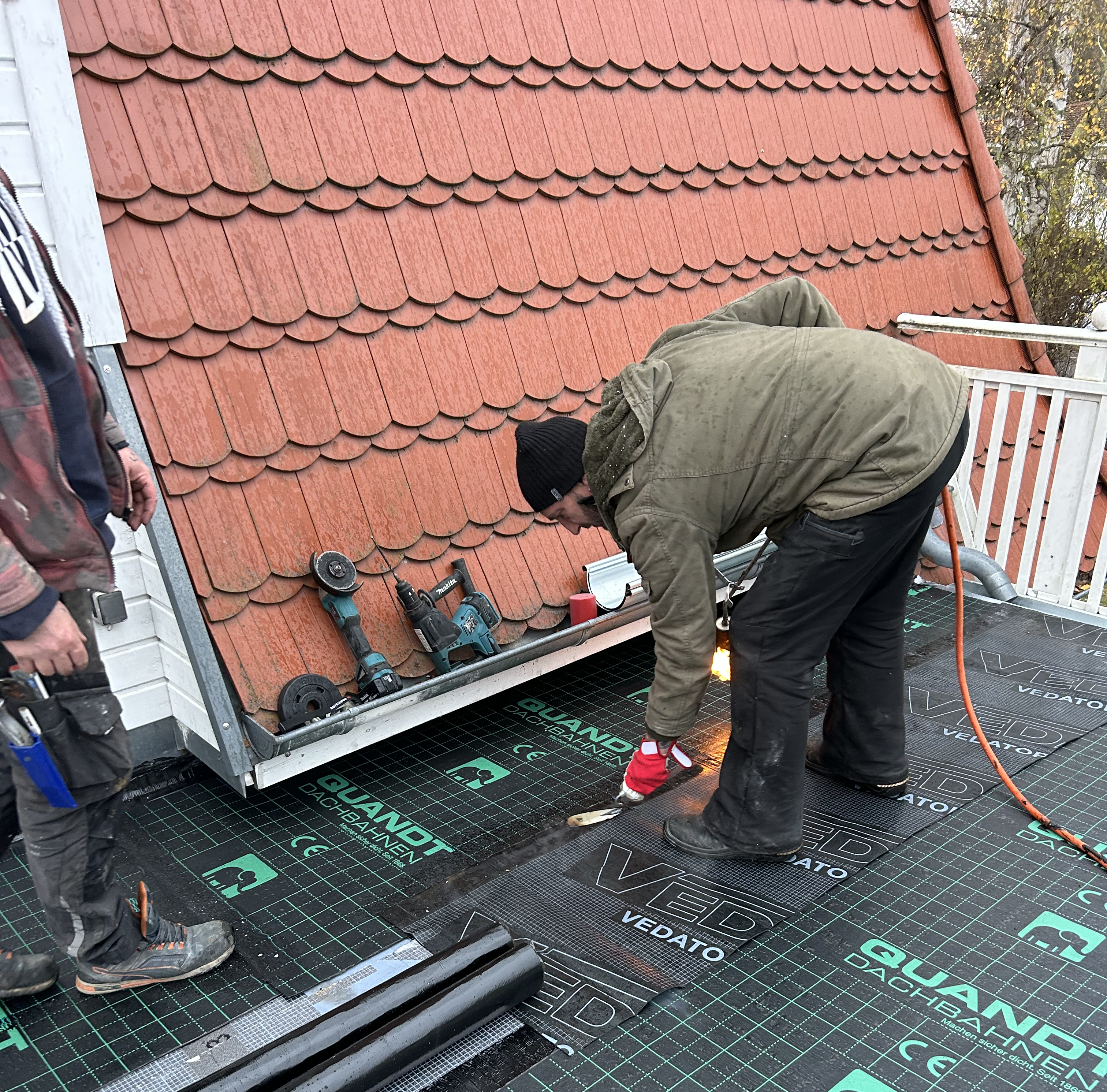 Im ersten Schritt wurde die alte Dacheindeckung vollständig abgetragen. Anschließend haben wir die bestehende Dachkonstruktion gründlich geprüft und wo nötig ausgebessert. Auf die Sparren wurde eine diffusionsoffene Unterspannbahn der Marke Delta Maxx Plus verlegt. Dieses bewährte Produkt zuverlässig vor Feuchtigkeit schützt und gleichzeitig Wasserdampf von innen nach außen entweichen lässt. Darüber folgte die sorgfältige Montage von Konterlattung und Traglattung als Basis für die neue Eindeckung.